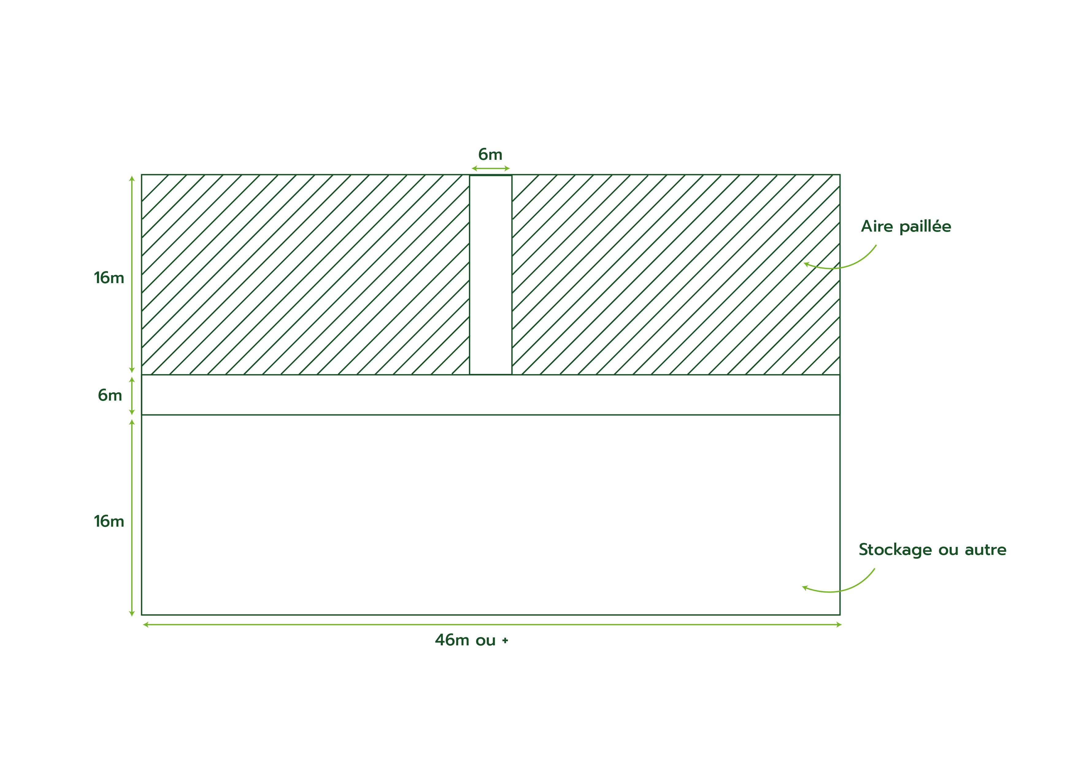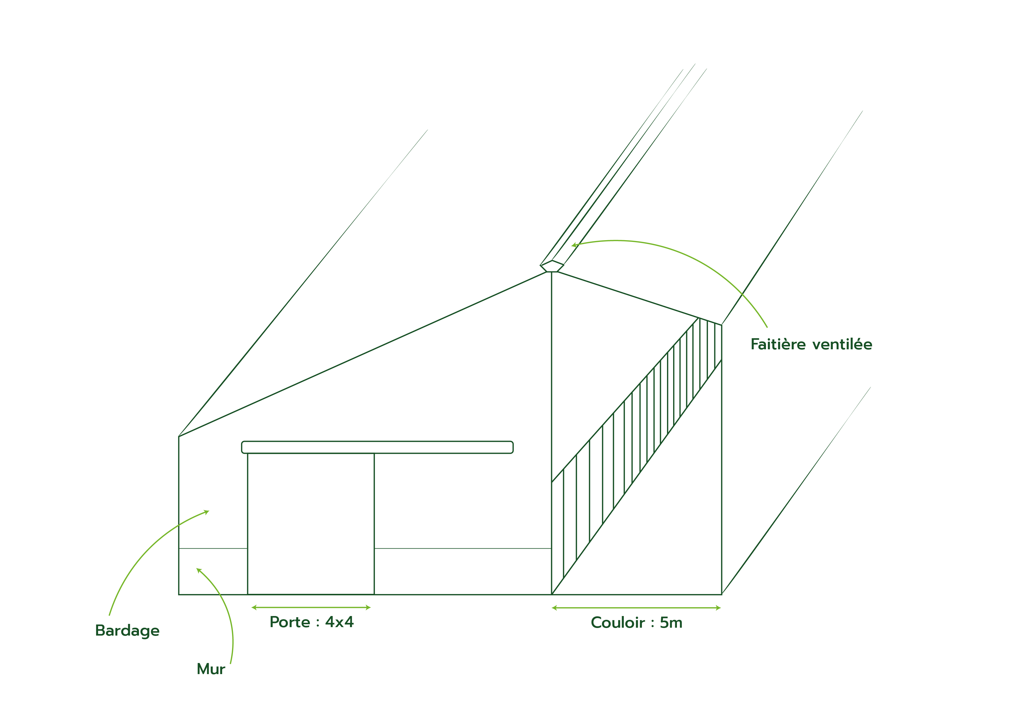 Le bâtiment peut également être aménagé en fonction de vos préférences : vous pouvez aménager la totalité du bâtiment en stabulation ou bien choisir de séparer votre bâtiment symétrique solaire en deux parties, avec un côté dédié à votre cheptel et une autre partie dédiée au stockage de votre matériel.