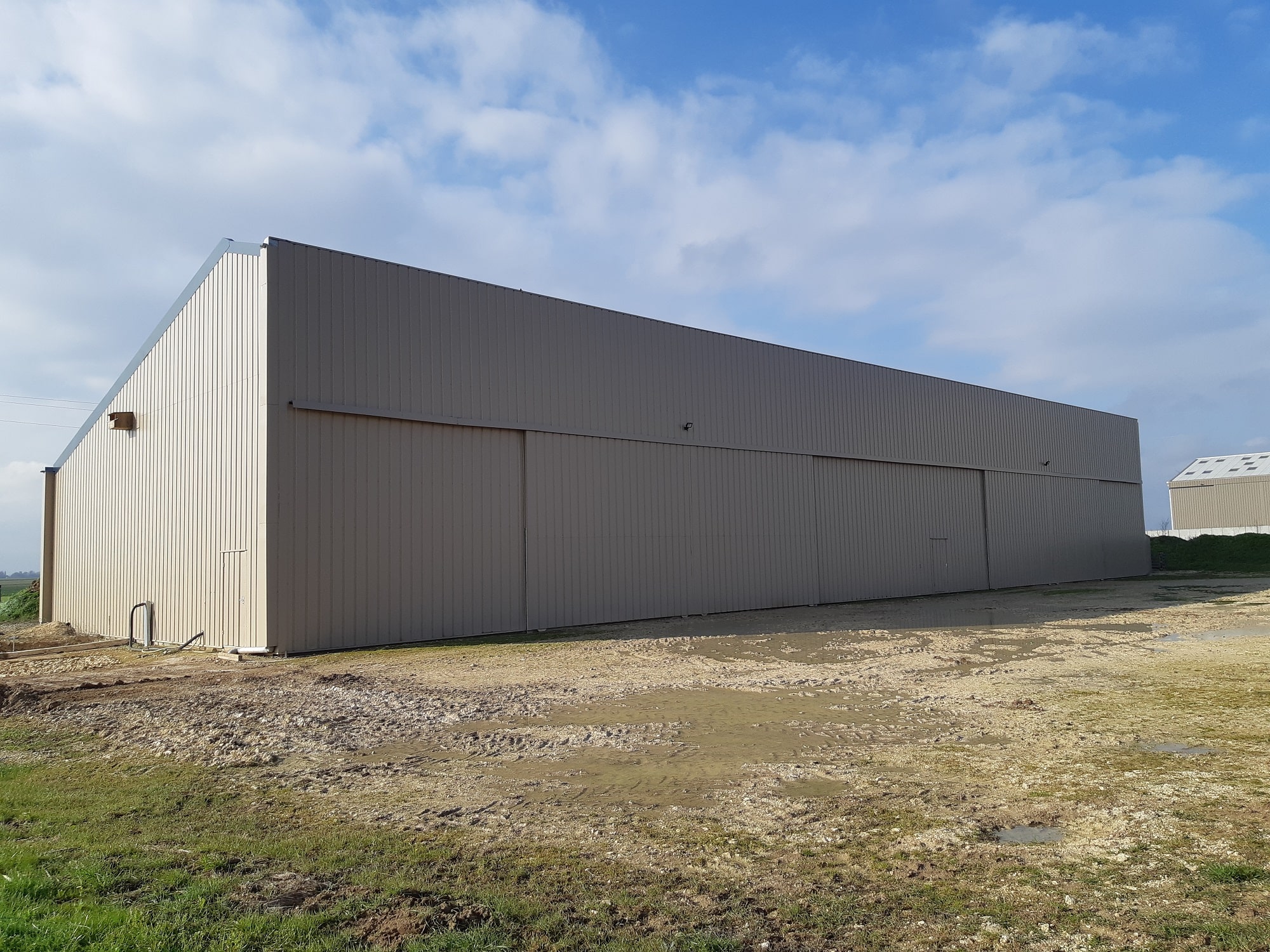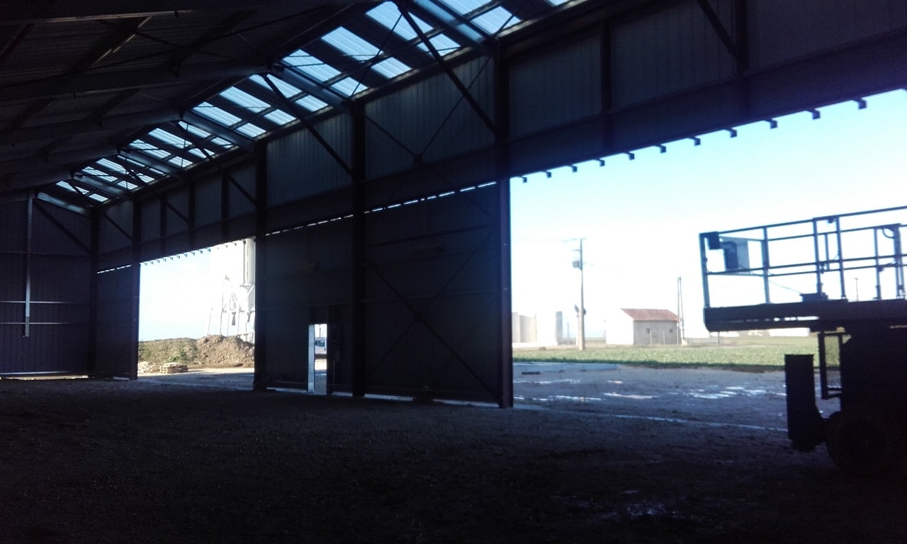 Il s’agit d’un bâtiment agricole solaire bardé sur 4 faces et complètement fermé pour sécuriser son matériel agricole. Sa surface de 785 m² permet d’abriter tout le matériel agricole de la céréalière. Pour plus de confort et d’esthétique, cette agricultrice bétonnera petit à petit le sol du hangar solaire.