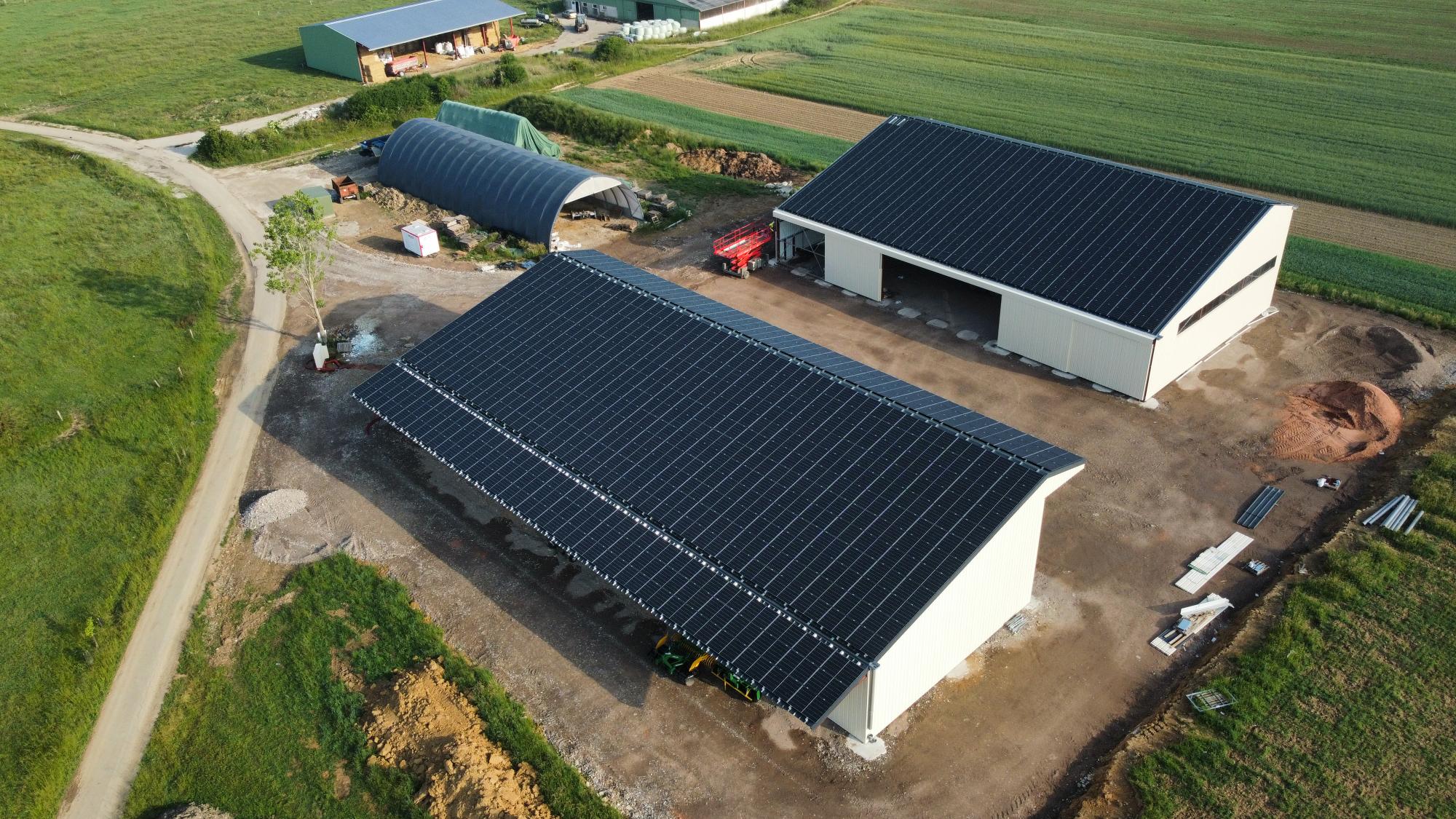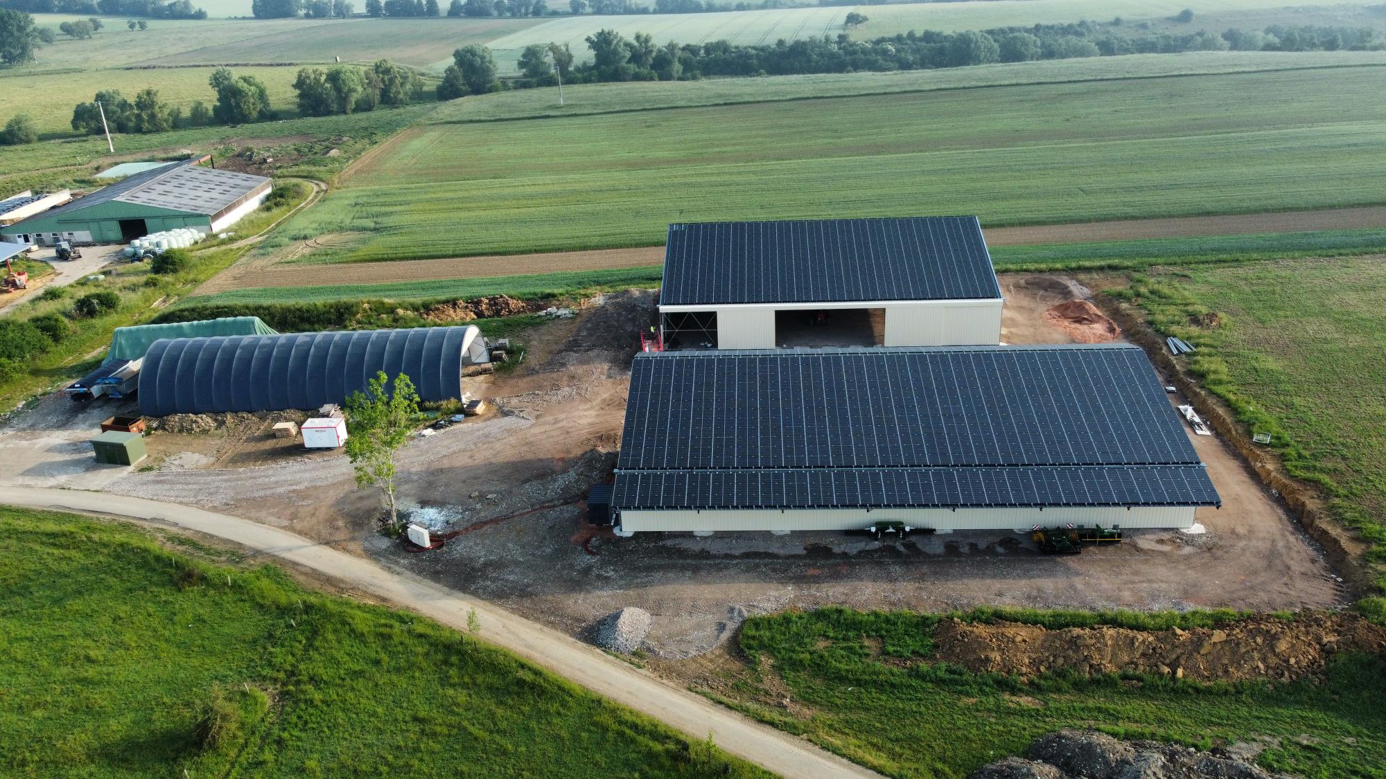 En Moselle, cet agriculteur a développé son exploitation et avait besoin d'espace supplémentaire, il a donc construit deux bâtiments solaires de 575 et 720 m². Le premier lui permettra de stocker son fourrage et le second de stocker son matériel attelé motorisé. Le premier bâtiment est équipé d'auvents au nord et au sud et lui permettent de gagner un peu d'espace couvert à l'extérieur, tout en ajoutant une rangée de panneaux solaires supplémentaires à son bâtiment.